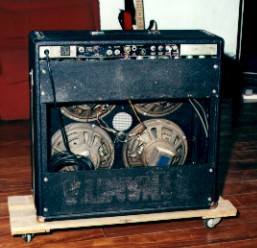 Este equipo que perteneci� al super violero argentino Gabriel "conejo" Jolivet, siempre son� terror�fico, (m�s si tocaba el "conejo") pero su circuito estaba muy alterado y su aspecto exterior peor, grille cloth de jersey negro y retapizado con cuerina com�n, con m�s voluntad que ciencia. Con el hallazgo en USA de un trafo original de Super Reverb '66, comenz� la reconstrucci�n primero del circuito original, desalojando la rectificaci�n de diodos que hab�an injertado para reinstalarle la v�lvula rectificadora que correspond�a al circuito original. El trafo original que tiene m�ltiples cables de salida, tambi�n permiti� alimentar todo el resto del circuito con los valores exactos de tensi�n y corriente que el equipo ten�a alterados. (El otro trafo tiene las caracter�sticas adecuadas por eso no fu� cambiado)